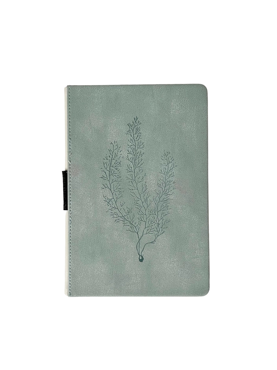 This vegan leather journal features a sea fir design embossed on a moss green hard cover and is styled with a beige spine. Other useful features include an elastic pen loop, a black ribbon bookmark, and a black elastic closure. Inside are 150 pages of white, recycled, lined, thick (120 g) paper.