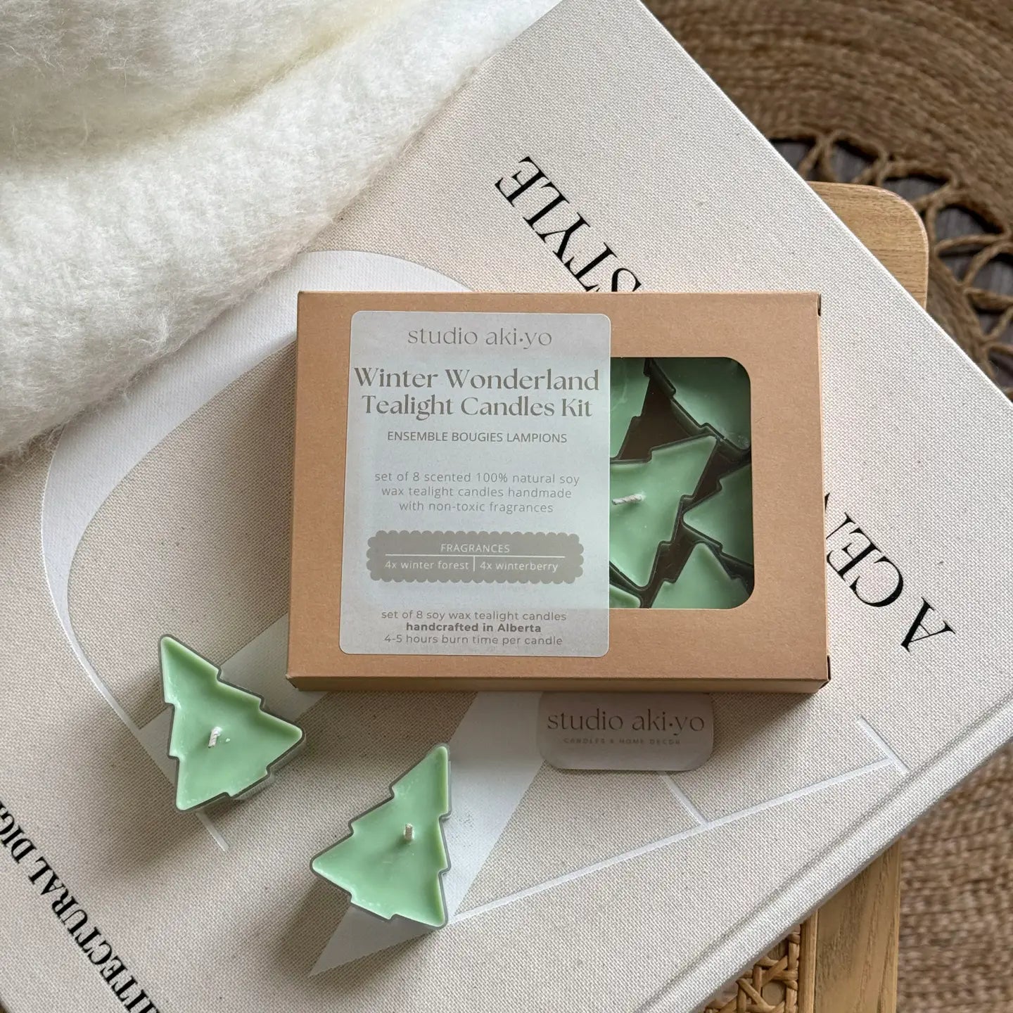Bring the cozy magic of the season into your home with these winter-themed green tree shaped tealight candles. Each set includes a total of 8 candles in festive shapes and scents: Winter Forest and Winterberry. Perfect for holiday gifting, decorating, or creating a warm, inviting atmosphere all winter long.